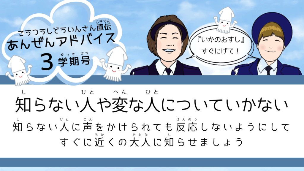 ついていかない! くるまにのらない! おおごえをだす! すぐにげる! おとなのひとにしらせる!